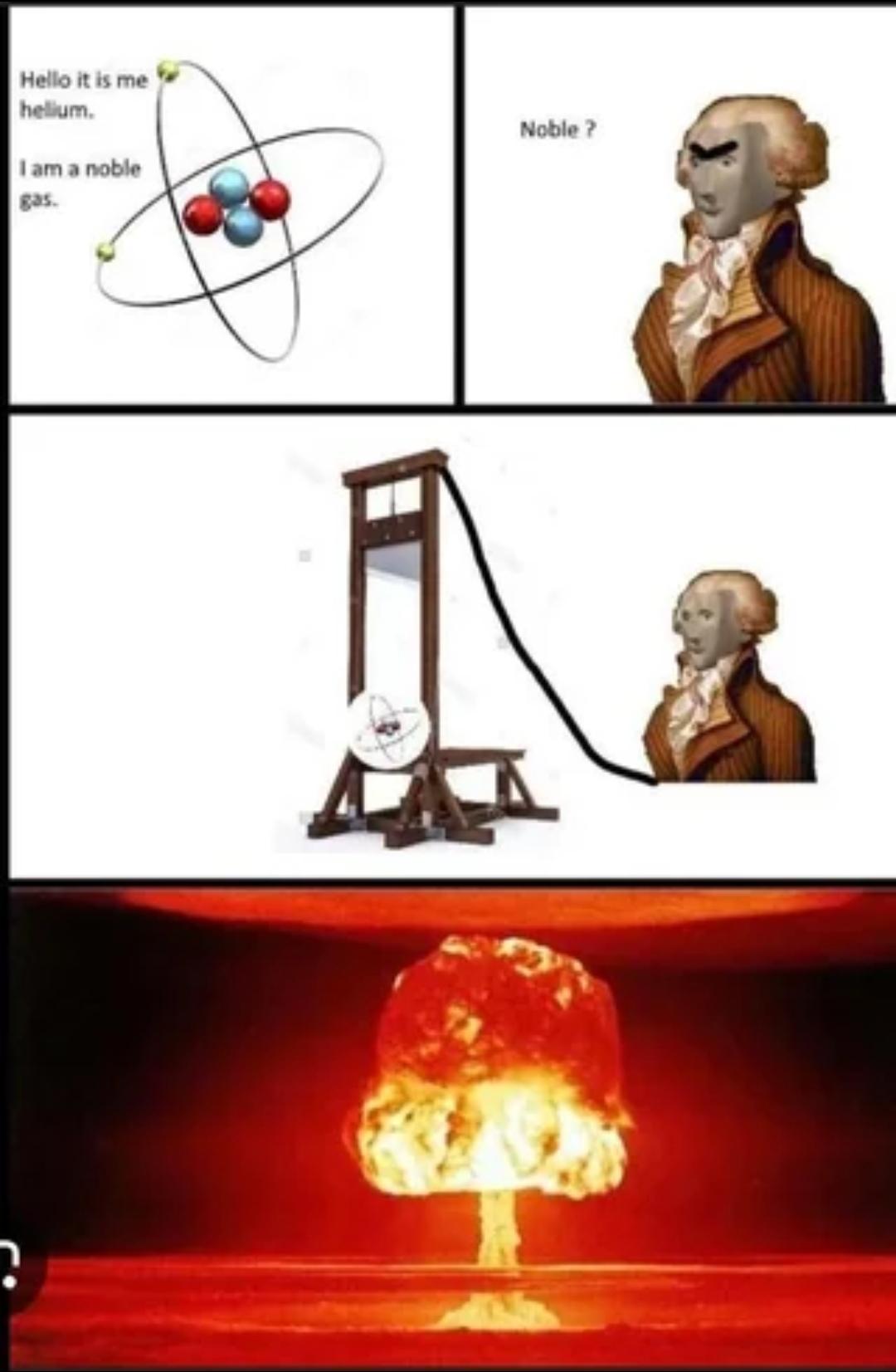 Krap I gotta be That Nerd and point out that helium ain't rly fissionable, it'd take more energy to split that atom than you'd get from the result, there ain't no helium isotopes, there'd be no neutrons released to sustain a reaction, but heck we can't let all that get in the way of a meme dangit!
