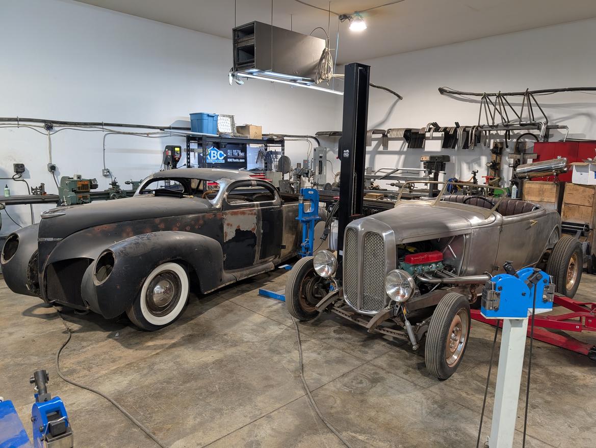 Here are a couple of the cars they're working on in the shop. The roadster has a custom grille shell, grille, hood, firewall, floors, inner door panels with brass bead rolled inserts, a custom bomber style seat frame, yada yada. The Lincoln Zephyr is even more radical; it started as a 4 door sedan and Karl is transforming it into a 2 door, chopped coupe! Check out his channel for recent videos as he's basically hand forming the entire back half of the car.