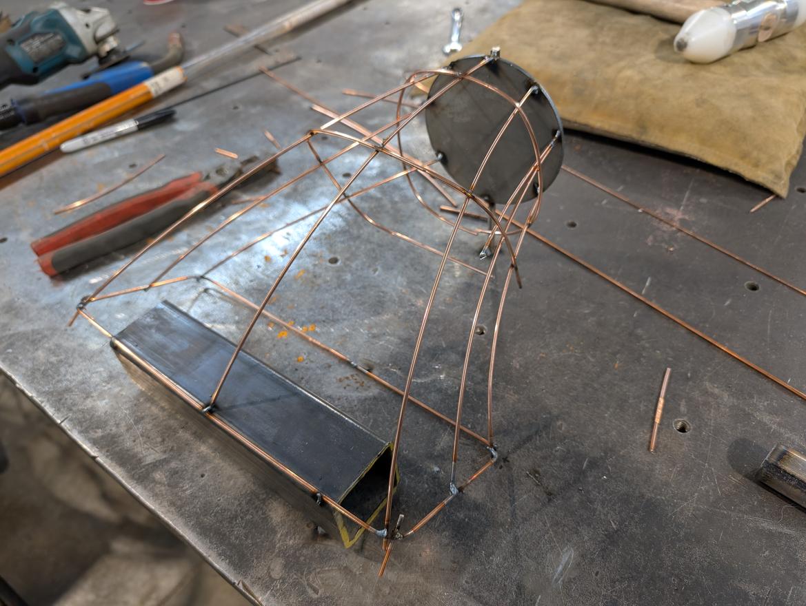My Sunday project was a trial at making a wire form and shaping an aluminum piece to fit it. I want to make a new air intake for my Z06, and this was a first try at the technique I'll use. I cut a 4" steel circle to represent the throttle body inlet, then made the rectangle to represent the air filter inlet. Then connected them with tacked sections of TIG rod.