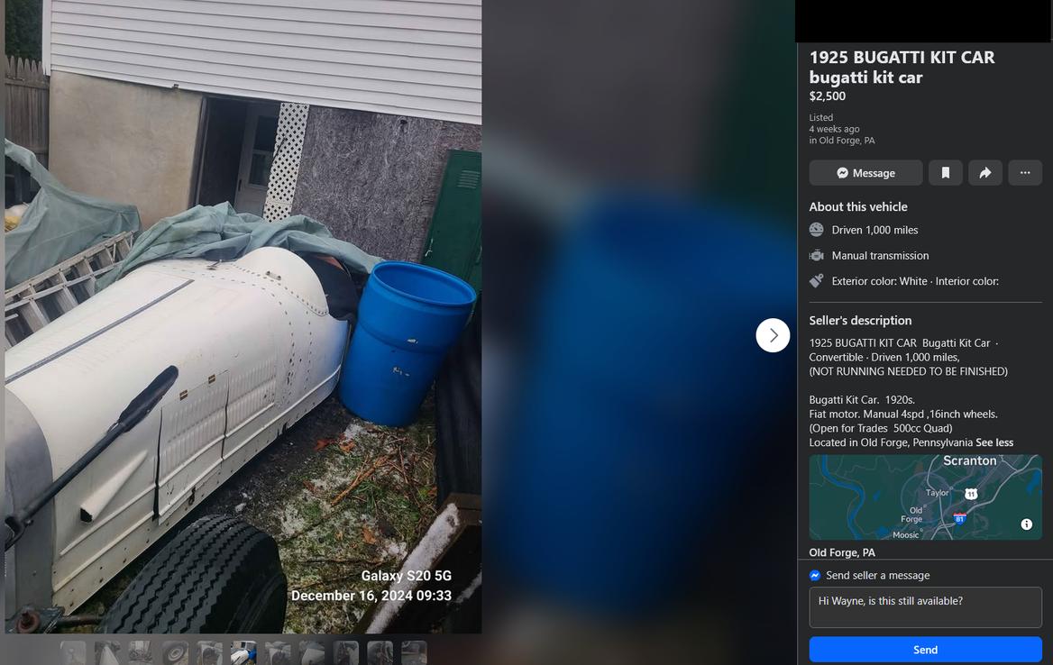 So a couple of things about the "Bugatti replica". First, it doesn't seem to be your typical VW Bug/beetle rear engine abomination. It states that it has a Fiat engine, there's a driveshaft sitting in one of the pictures and what looks like a straight axle out back with coilovers.