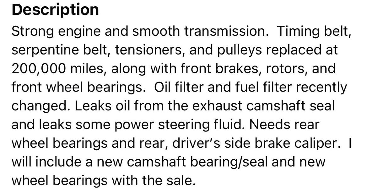 The $800 Volvo showed up in my feed and peaked my interest. I fully expect it to end up costing double that in the end (even with him having the wheel bearings and new VVT hub), but the interior/exterior condition and recent maintenance caught my attention. The work is doable, but would just have a learning curve on the oil leak.