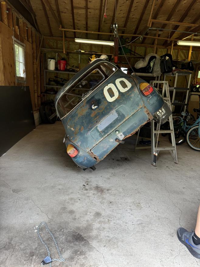 I have wanted to build a challenge car for a long time, I like weird things and I wanted something small and light. I came across this 1967 Saab 96 and after a few FBM messages from my wife to the seller a deal was struck and I hooked the trailer to the truck and hit the road today. I am still working on the full plan but the preliminary plan is a snowmobile engine powering the front wheels. The original is a 2 stroke and I would like to keep it 2 stroke. Next step is to get it in the shop and start cutting out the rusty floors and adding some actual metal back in.