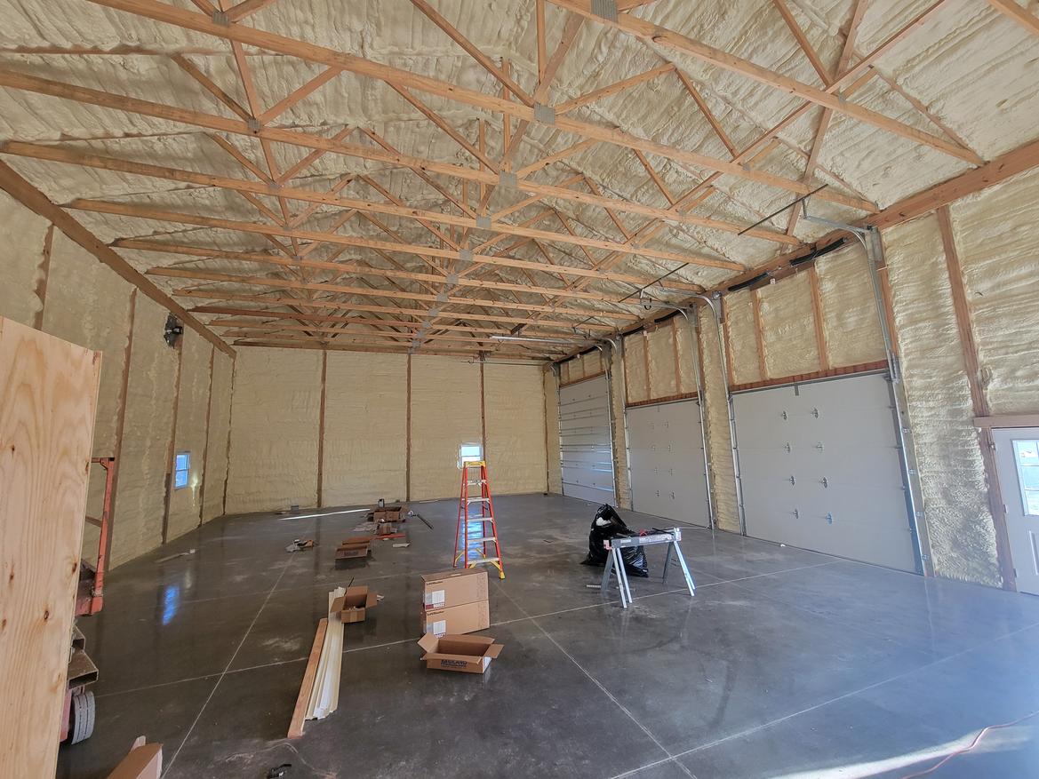 4" of open cell spray foam on all of the interior surfaces. I don't want to "finish" the entirety of the interior walls/ceiling at this point, so that ruled out blown-in or fiberglass insulation. Lance offered than he could do open cell on the ceiling and closed cell on the walls, but it would have been about 30% more money, and would only have provided slightly more impact resistance. Instead, I think I'm going to work toward "paneling" the walls to 8' with plywood to protect the foam where it is most susceptible to damage and to give me a surface I can use to hang tools and the like. We'll see how that line of decisions play out as hindsight gets longer.