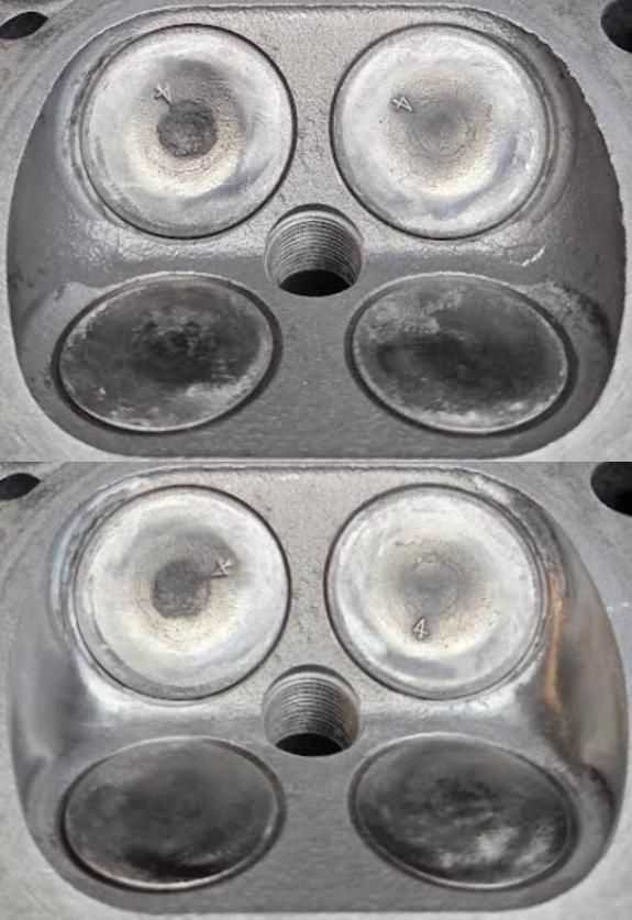 On the exhaust side, the bowls are larger, and the taper is shallower