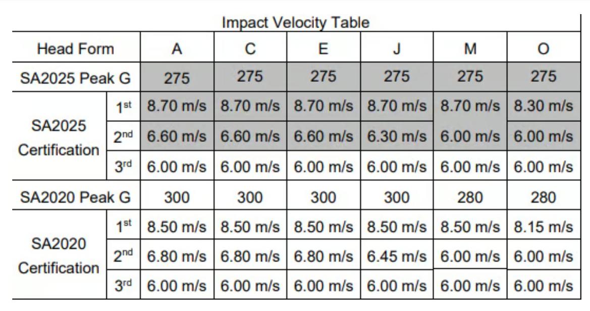 I have a chart below which shows the range of headforms, the impact velocities they are tested at, and the Peak G limit which cannot be exceeded in order to receive SA2025 homologation (as well as what those velocities and Peak G limits were for 2020). For reference, "A" headform is the smallest (think X-Small, Small sizes) and "O" is the largest (X-Large and 2X-Large). One of the main changes in SA2025 was to better align Snell's Peak G limit to FIA 8859-2024, and both standards require a maximum limit of 275g.