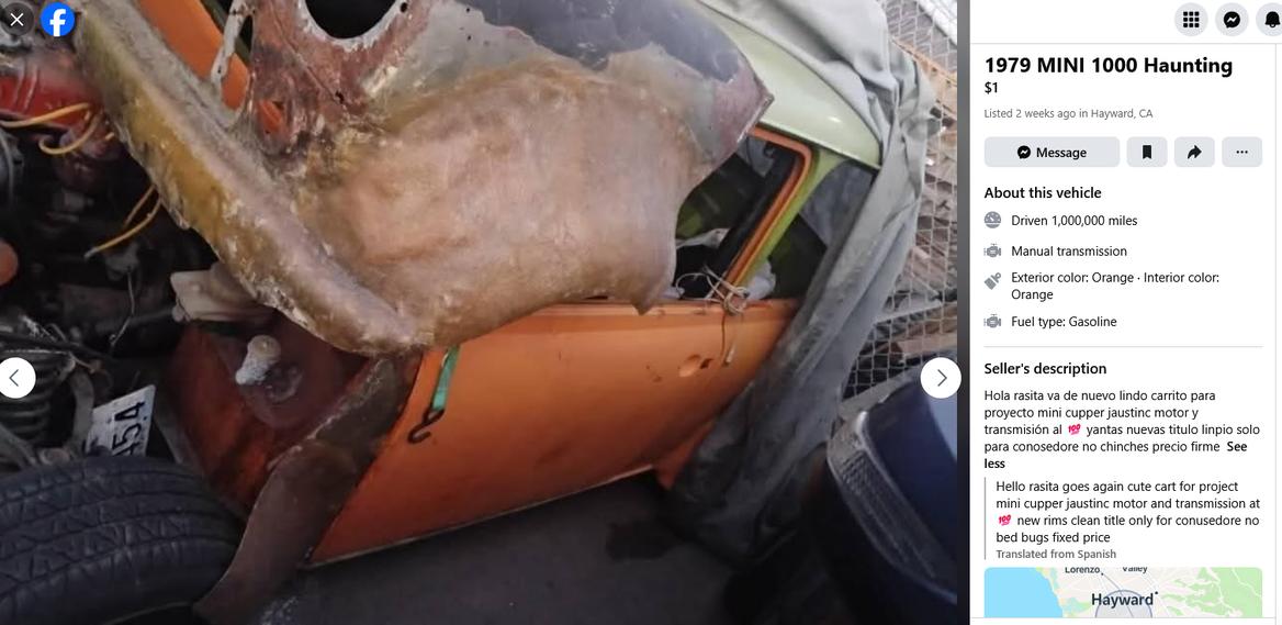 No idea what's going on here. Looks like a half baked RWD conversion to a '79 Mini with a wide body/fiberglass front end. Advertised for a single buck and they're firm on price. According to the translation, there are no bed bugs.