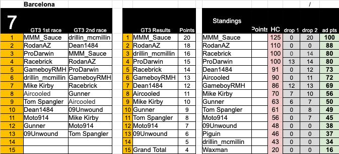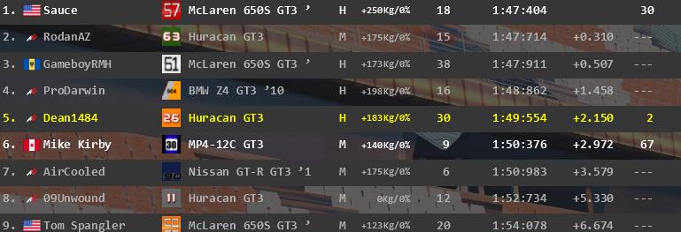 A very tricky track last night. I was running a very low down force setup my car that was very susceptible to any kind of bump from other cars. I probably should have run Rodans setup. All in all I was happy with my run. I spent quite a bit of time running alone but I did have a couple good runs with Mike and Gameboy I thought was going to get me but something happened and he fell back.