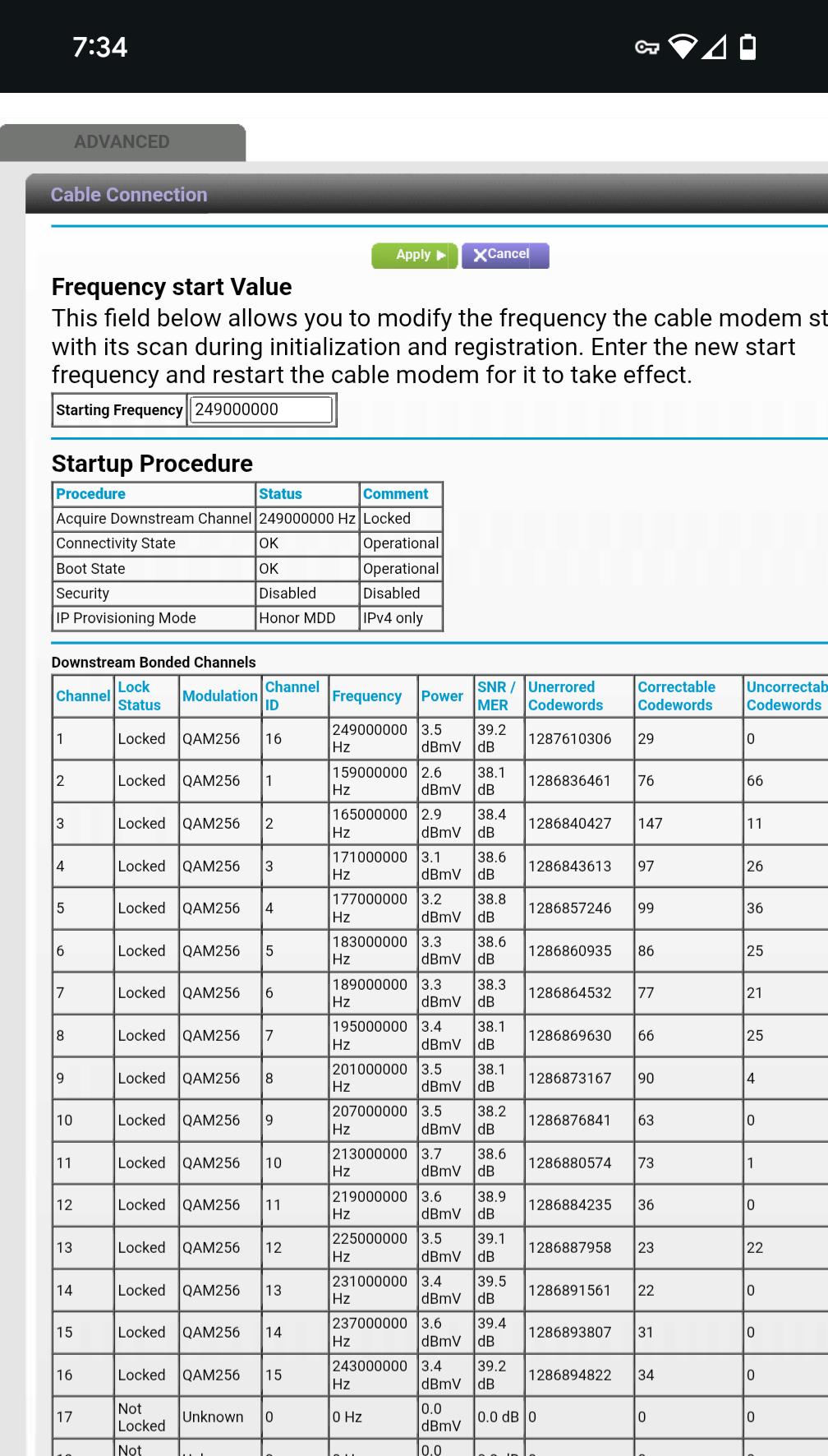The important items are power and SNR. Netgear says +/- 7db. Last I knew cable tech spec was +/- 10db but down to -15db would work. More important than that is the SNR. 32db on that is the lower limit but I liked to see that 34db or higher.