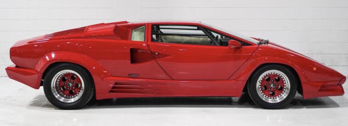 Lamborghini celebrated its 25th anniversary with a 25th Anniversary Edition of its Countach. Of the 650 or so examples made, this one came from the factory with one-off wheels painted to match the car.