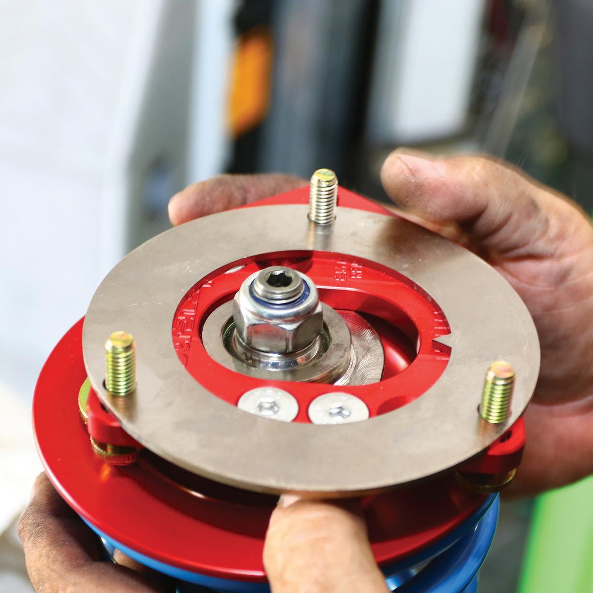 Aftermarket camber plates can easily add more negative camber. Some, like these, are adjustable; others simply reposition the top of the strut to a new, fixed location. Photography Credit: David S. Wallens