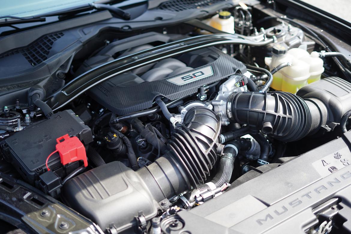 The Dark Horse is–at least until the insane Mustang GTD drops–the gnarliest pony in Ford’s stable, with a 5.0-liter Coyote V8 cranking out 500 horsepower and 418 lb.-ft. of torque through either a Tremec six-speed manual or, as found in our test car, a 10-speed automatic.