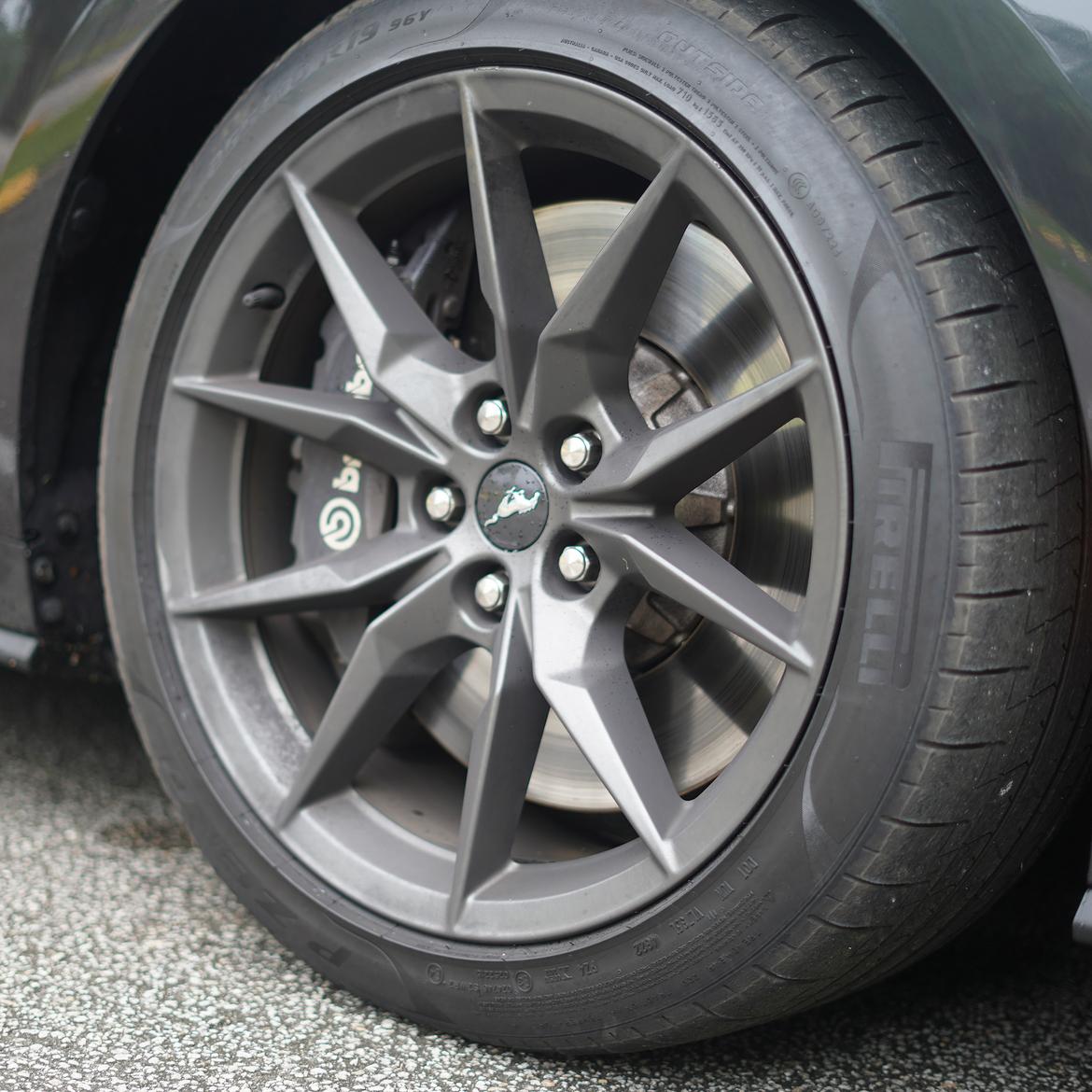 The brakes definitely impress, and Ford has done a good job speccing the pad compound as well. The pads came in with just a bit of heat and retained good bite and consistent feel through our test sessions. Hauling down 2 tons from more than 110 mph requires turning a lot of kinetic energy into heat, and the big Dark Horse brakes can easily handle that energy transfer.