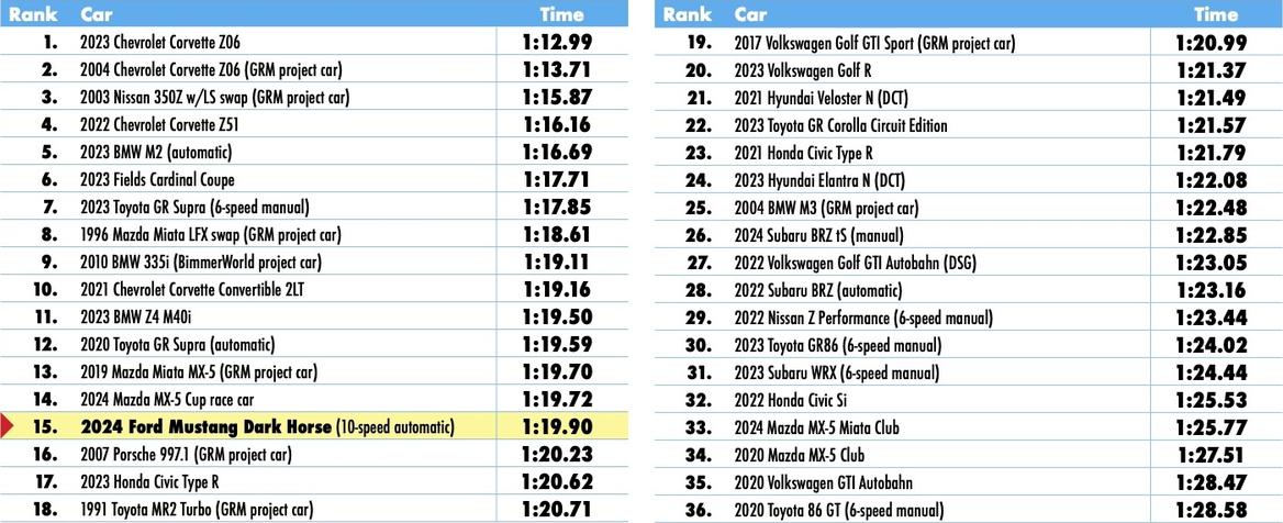 Our 1:19.90 lap time in the Dark Horse puts it toward the back of the pack of premium sports cars, giving up seconds or more to market competitors like the Supra (1:17.85), BMW M2 (1:16.69) and Corvette Z51 (1:16.16).
