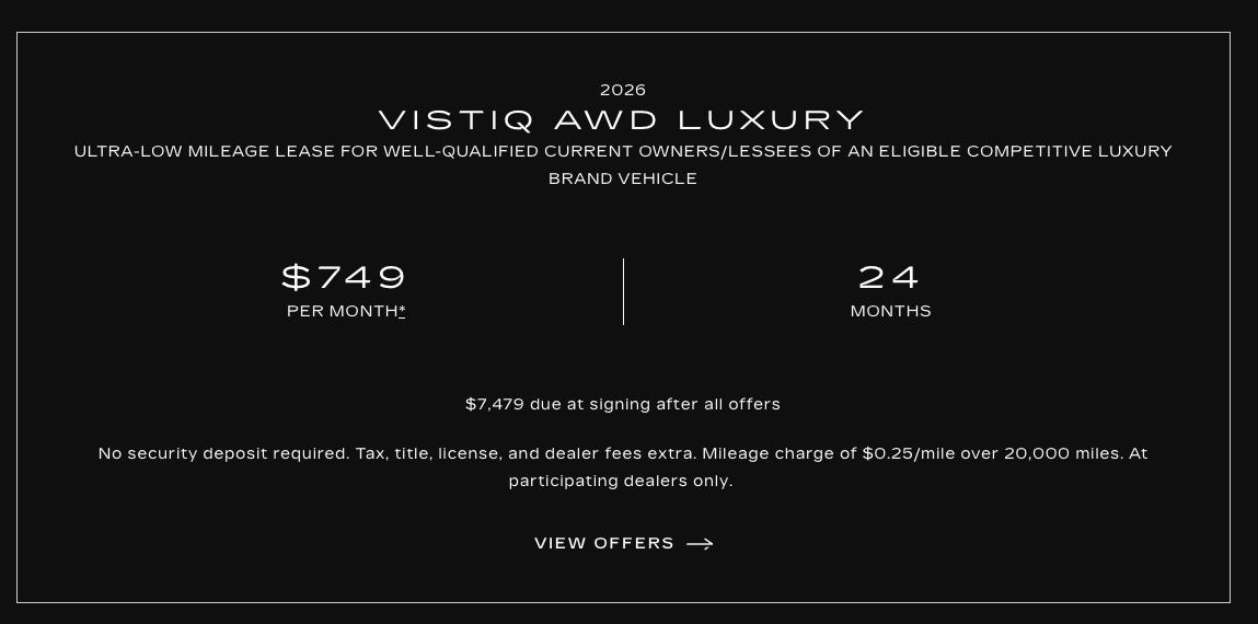 You wrote: lease deals as low as $749 per month. (The details, of course: 24 months, $7479 due at signing and 25 cents per mile over 20,000 miles.)
