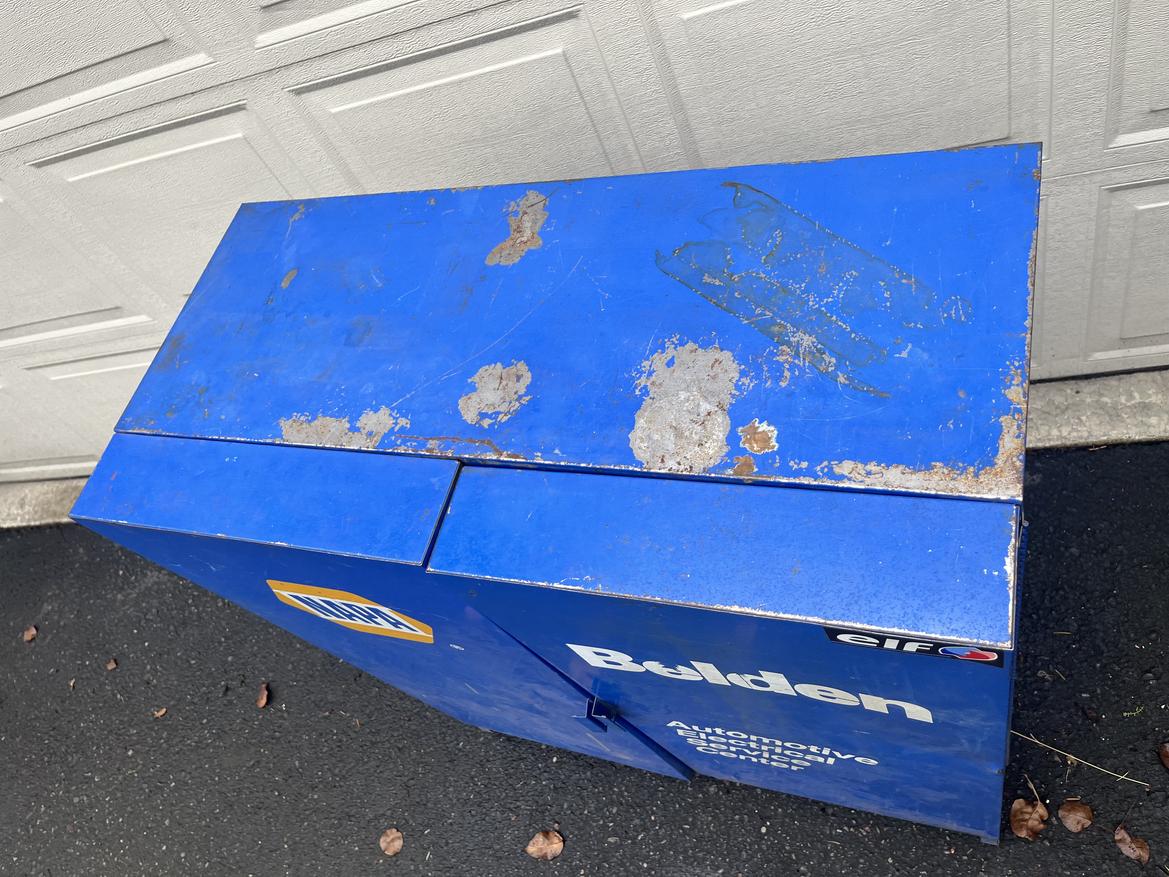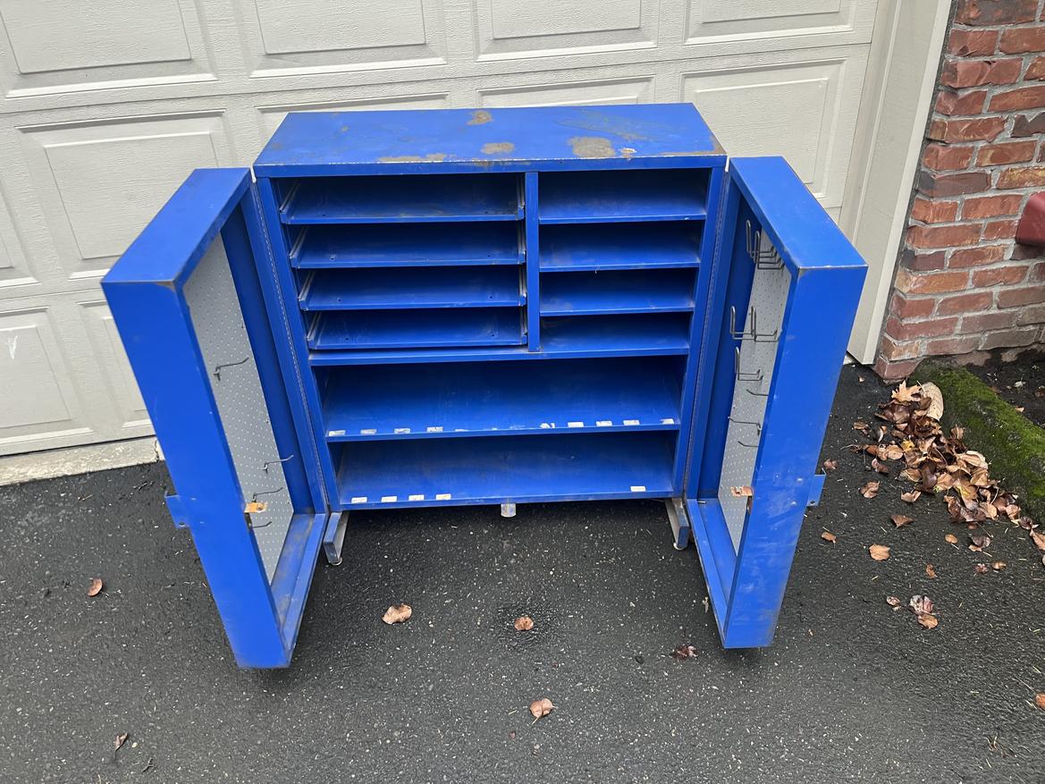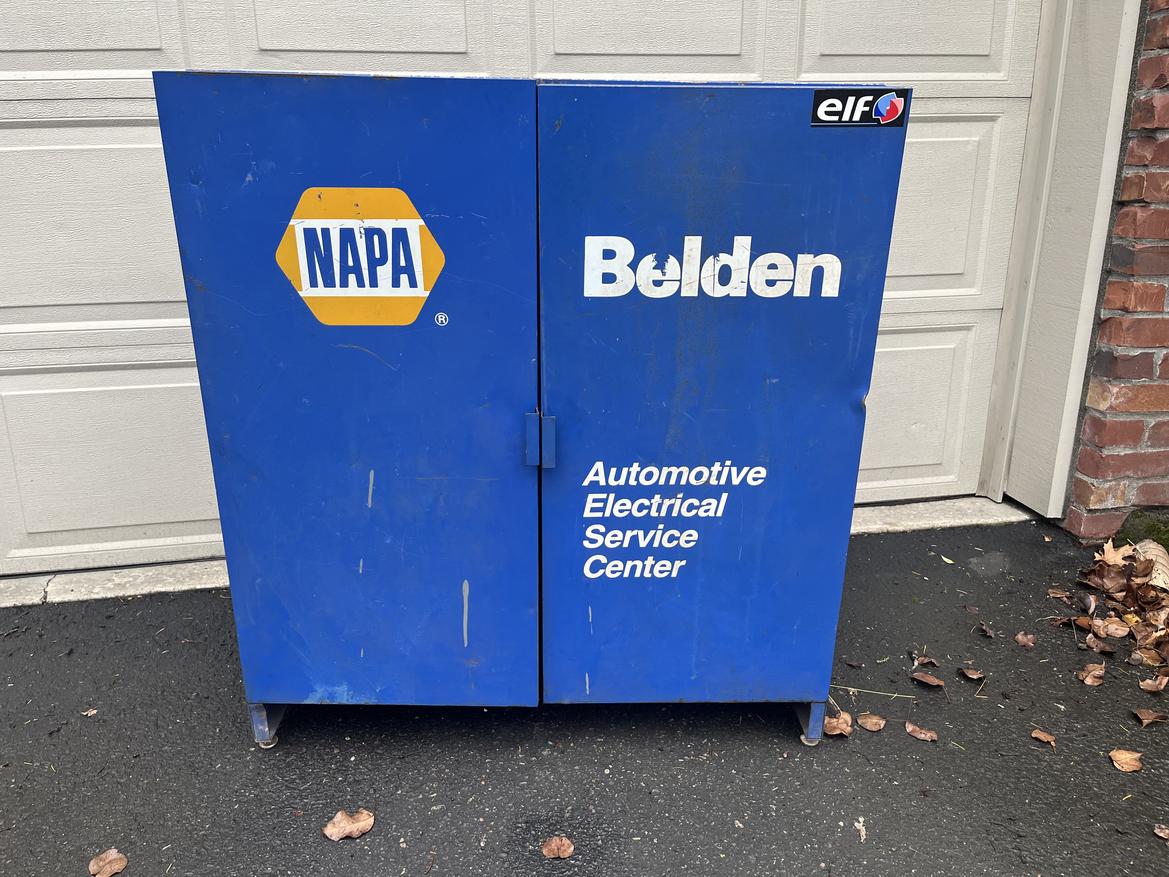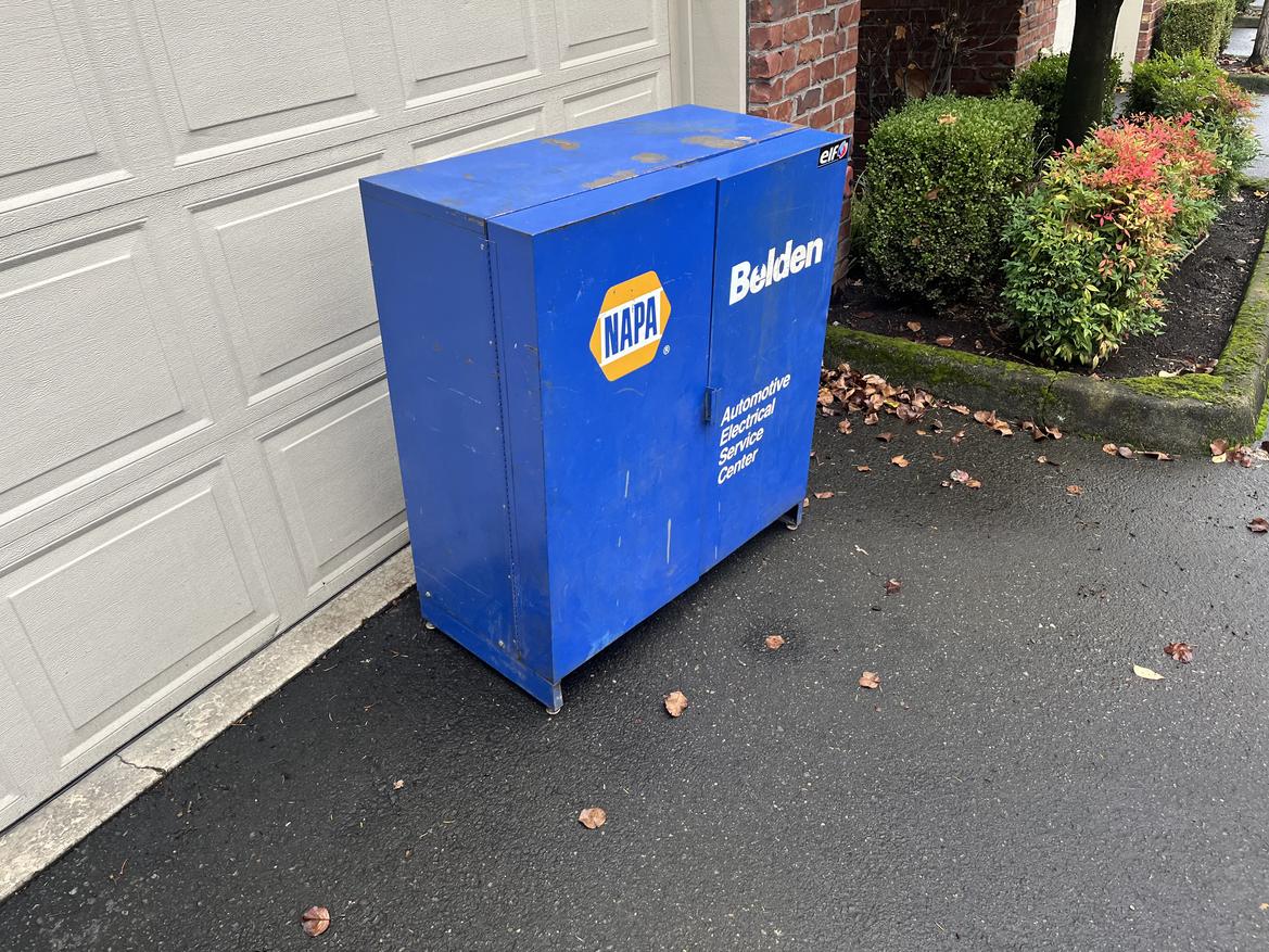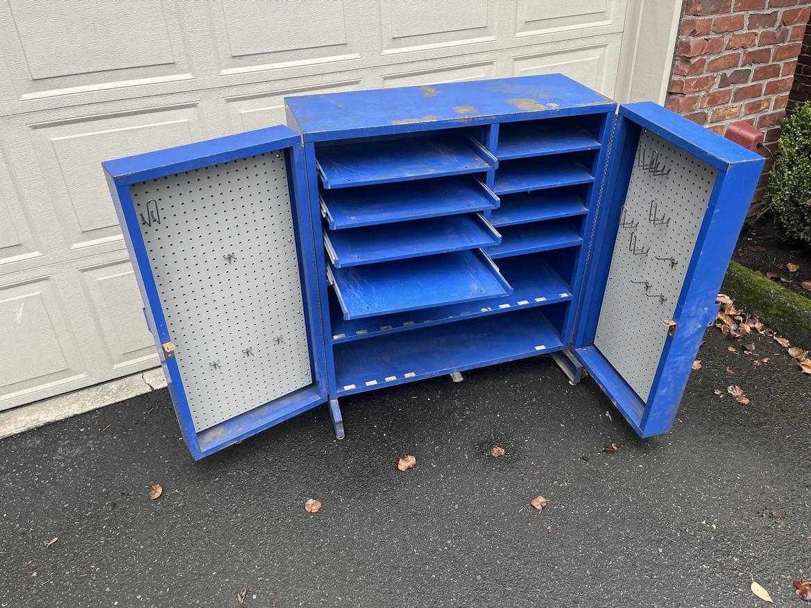 Metal Belden cabinet with shelves, sliding drawers, and pegboard. Good used condition with great patina. Perfect for your garage or man cave. Asking $150 OBO. Located in Portland, OR.