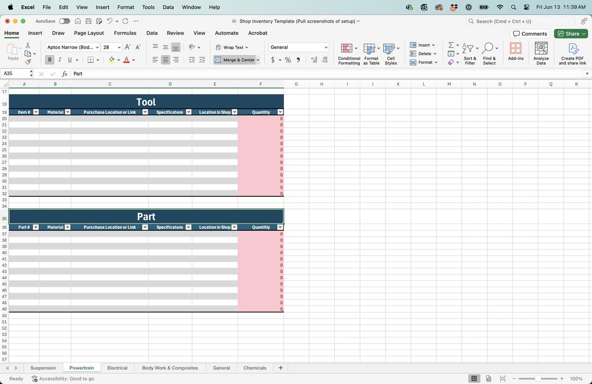 Avoid dumping everything into the sheets randomly. Organize your columns and create subgroups. You can even categorize items by part number, importance, quantity on hand and location in the shop. If you like ordering things online, include links.