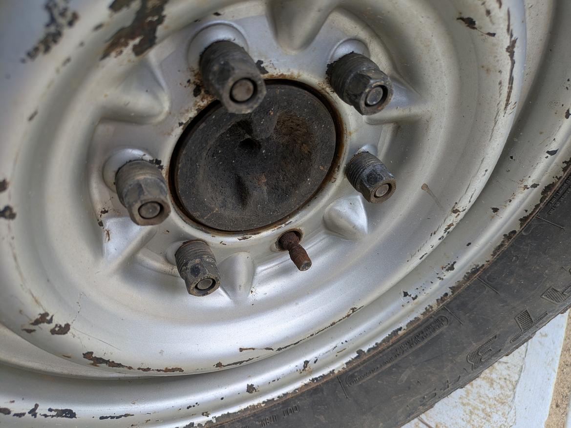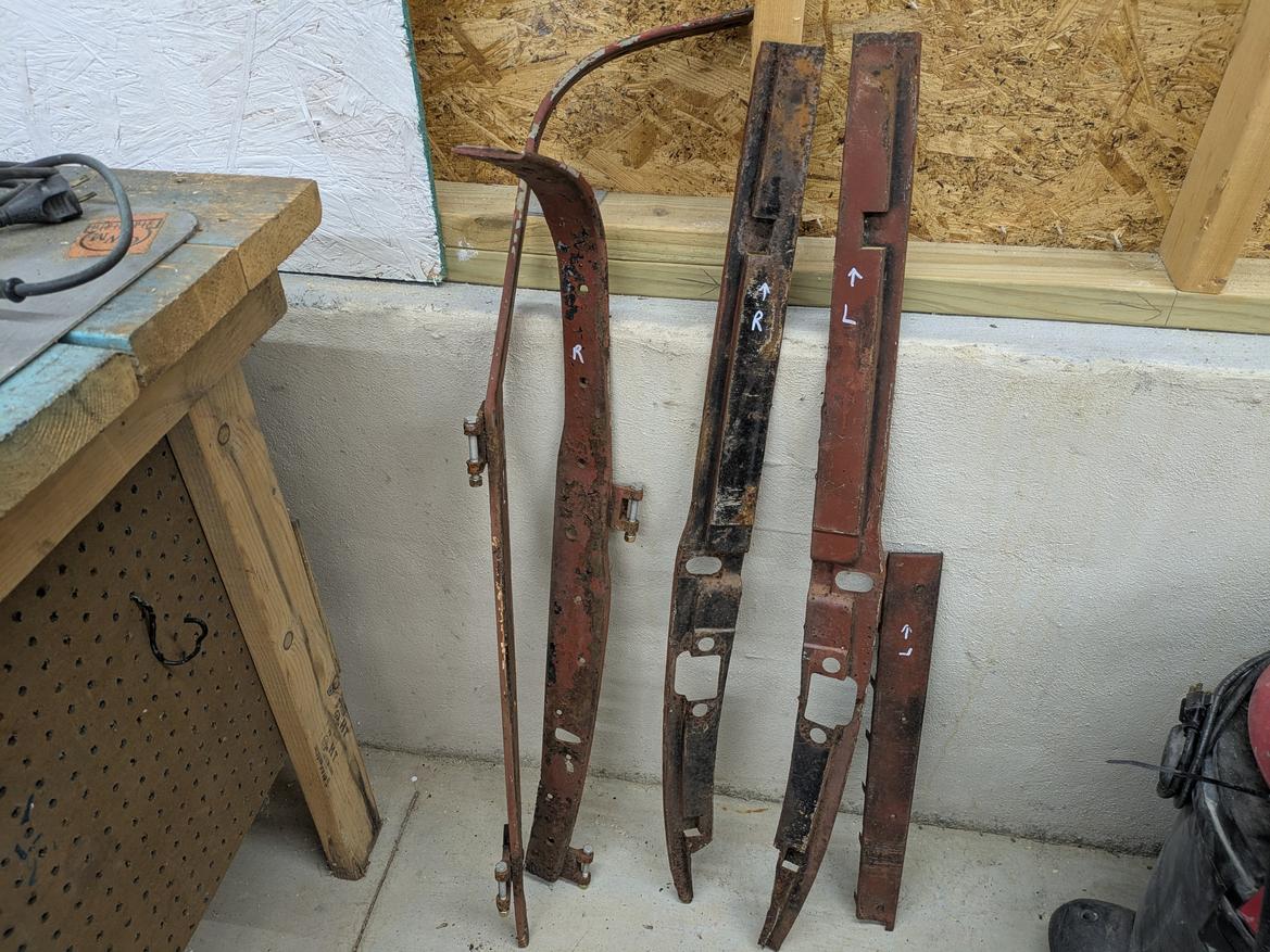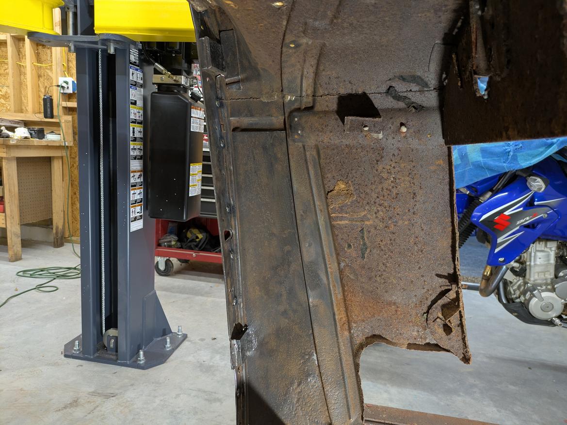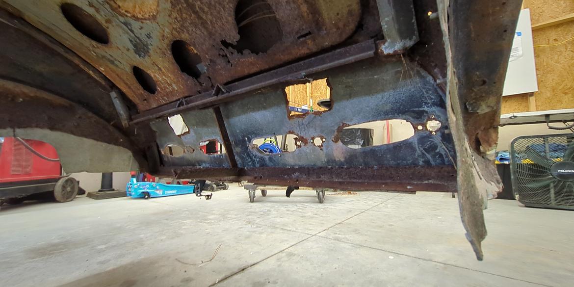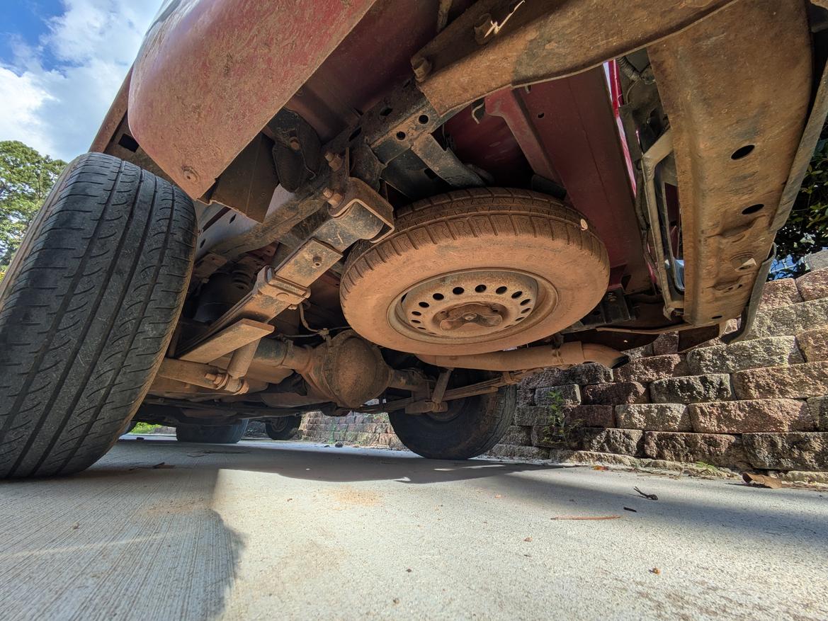 No rust, but plenty of that red Georgia clay. Also shown is the 10-bolt 8.0" rear end and one of the front drag wheels.