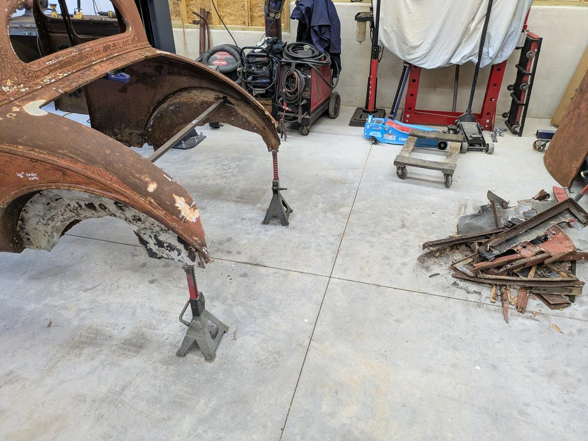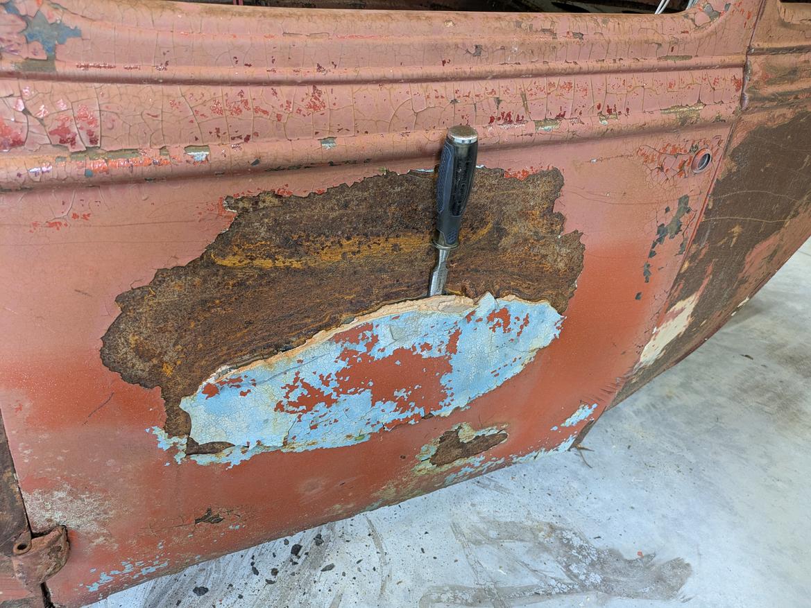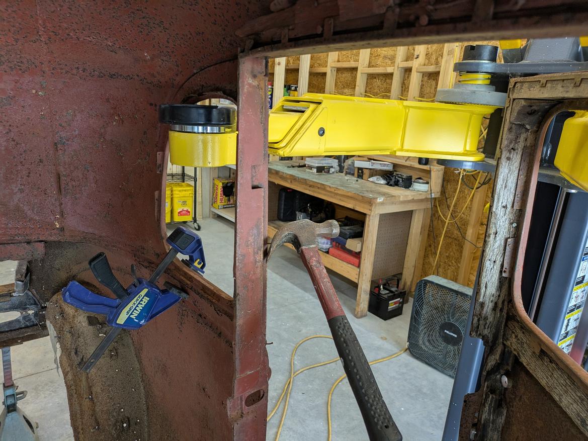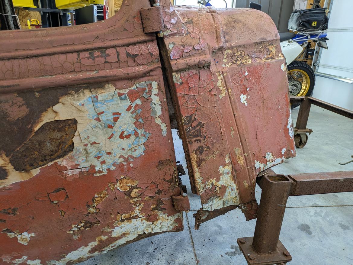 No rust, but plenty of that red Georgia clay. Also shown is the 10-bolt 8.0" rear end and one of the front drag wheels.