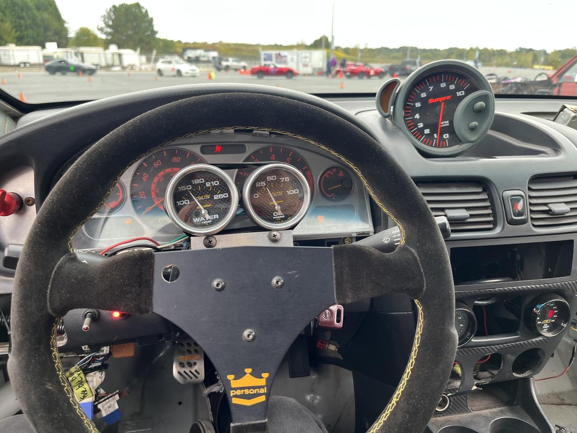 It seemed to be running OK but on on the way to the start line (after a full lock right-hand turn) it almost shut off again. I completed the run. At the same exact spot with the steering at full right-hand lock again, it did the same thing. Hm. When I got back to grid I told Duster there had to be something rubbing the steering. Sure enough, his sharp eye caught a wire that had worn through and was grounding out against the steering rack! I still haven't looked into what exactly that wire is but I wrapped it with some electrical tape and held it up out of the way with a few zip ties and we had no other running issues the rest of the day.