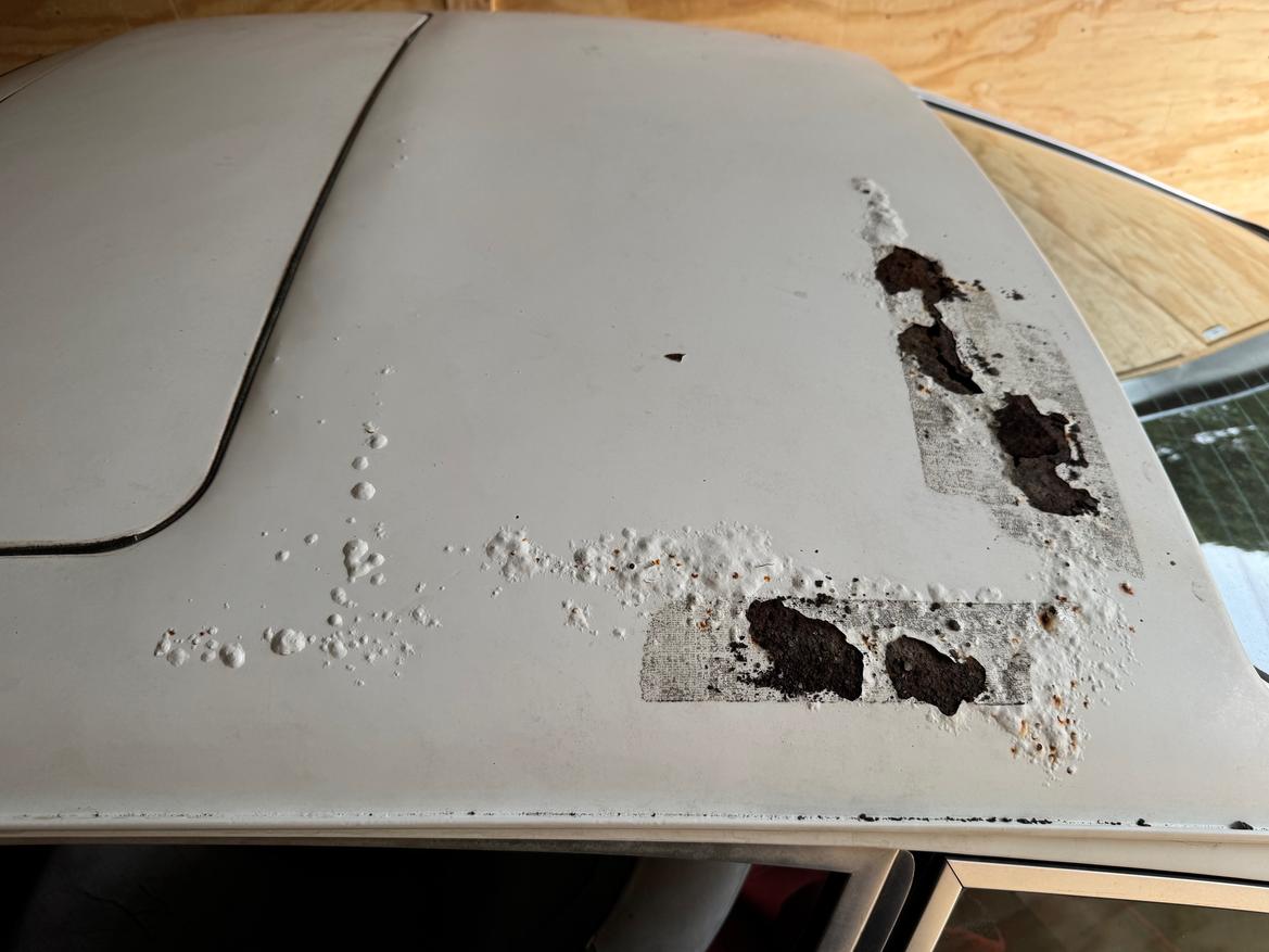Cleaned up and on the lift. These cars are galvanized from the factory, so fortunately rust is limited to two spots, but both will take some work. Front suspension pan had dirt blown up against it, so it rusted through up front, so I'll replace the entire pan. The roof panel was another story, it apparently had been rusting from the inside out, so all around the sunroof reinforcements welded to the outer skin, yet the pilars and windows front and rear are solid. Everyone has told me the sunroofs are a pain and not worth keeping, so picked this up on FBM and will use it to make it a slicktop.