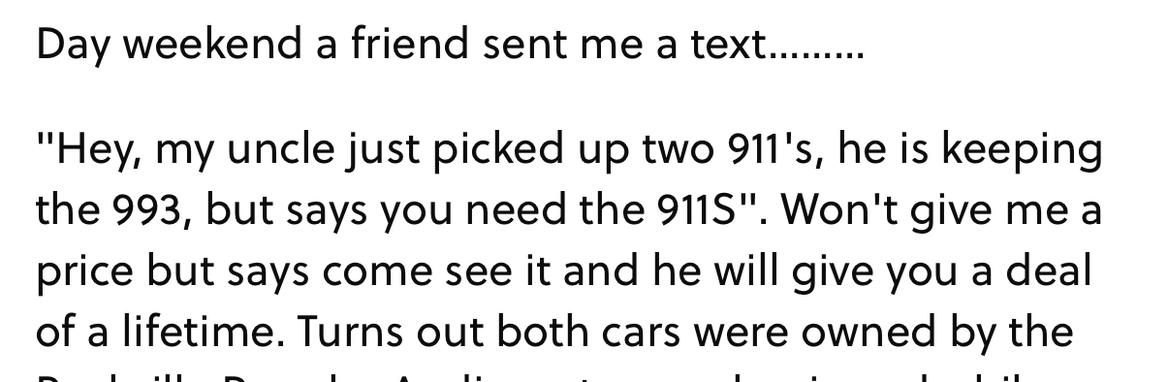 "Hey, my uncle just picked up two 911's, he is keeping the 993, but says you need the 911S". Won't give me a price but says come see it and he will give you a deal of a lifetime. Turns out both cars were owned by the Rockville Porsche Audi master mechanic and while rough from sitting, have rebuilt engines, etc....