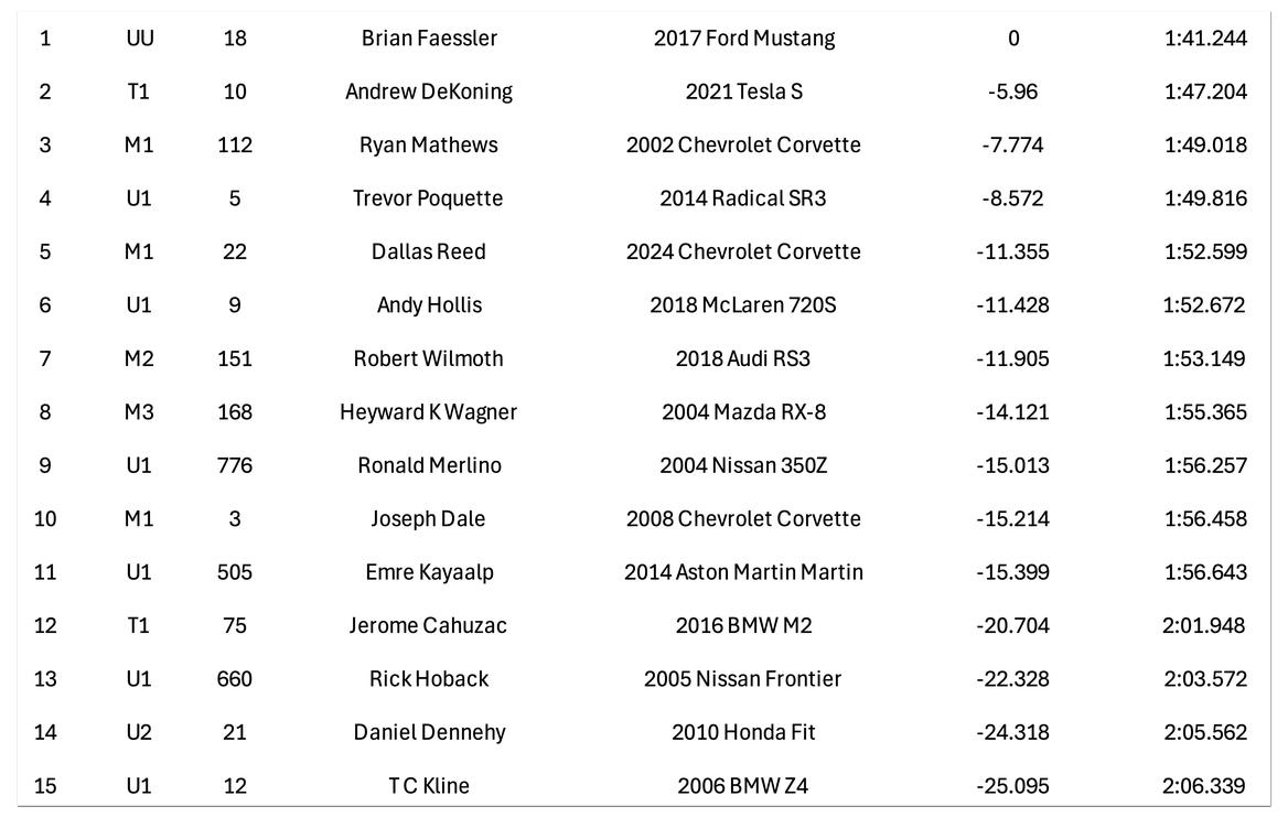 This year, that winning formula is a built Ford Mustang, driven to the fastest lap time of 1:41.244 by Brian Faessler.