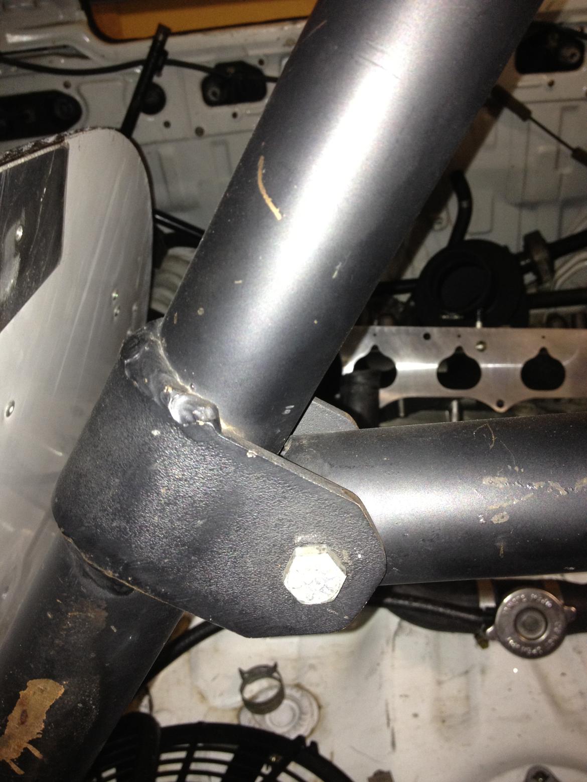 Center is a full diagonal from top corner behind the driver to bottom plate by the passenger footwell. Harness bar is only on the drivers side. Each joint looks like the pic below. The bolt holes in the tube ends have small tubing welded inside for clamping strength.