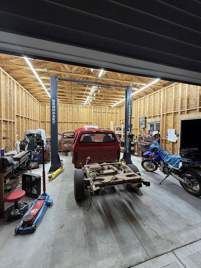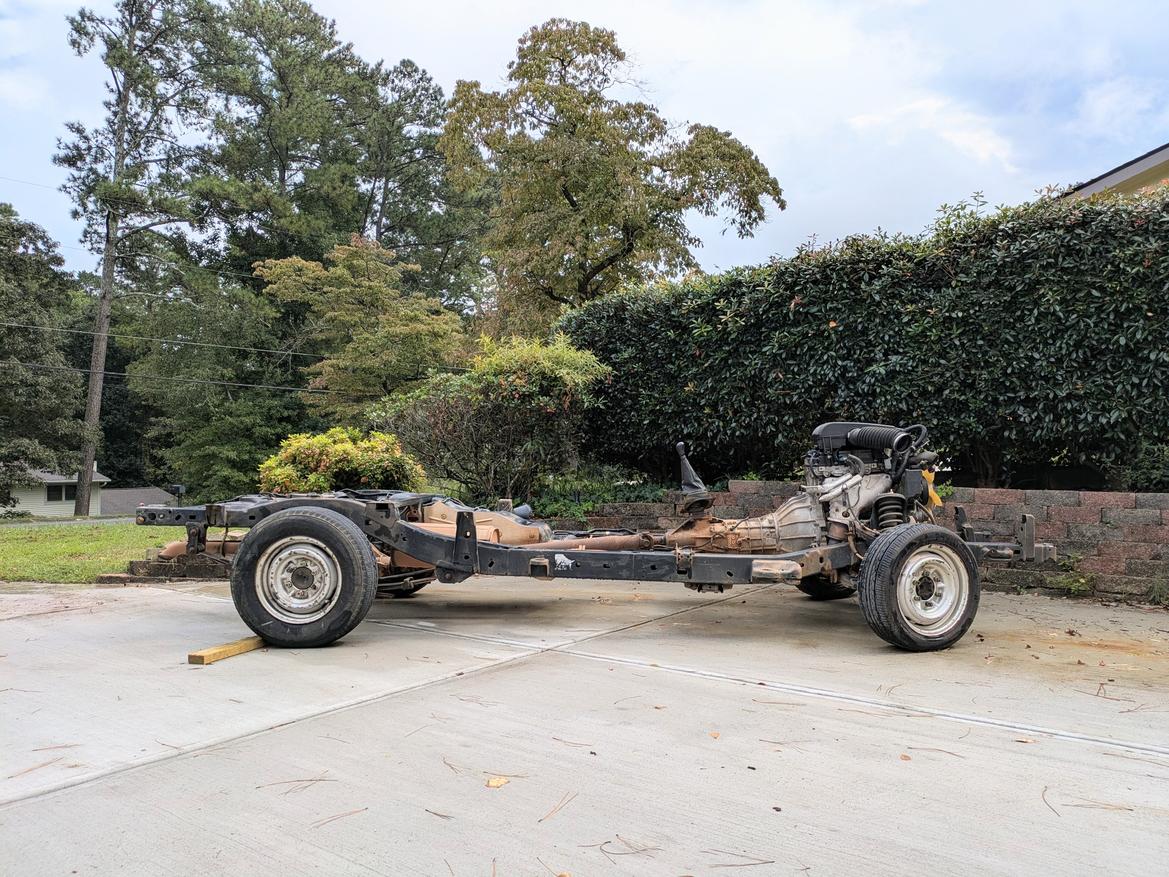 Like I thought, the drivetrain will have to move rearward by a foot or so. A regular cab 4x4 driveshaft solves this, plus some cutting and welding of the cross members. The gas tank might be okay where it is. And overall I like the curvature of the frame, how it kicks up over the front and rear axles smoothly. I can definitely work with this, especially without any rust. Next I'll roll it under the coupe body and see how the widths match up.