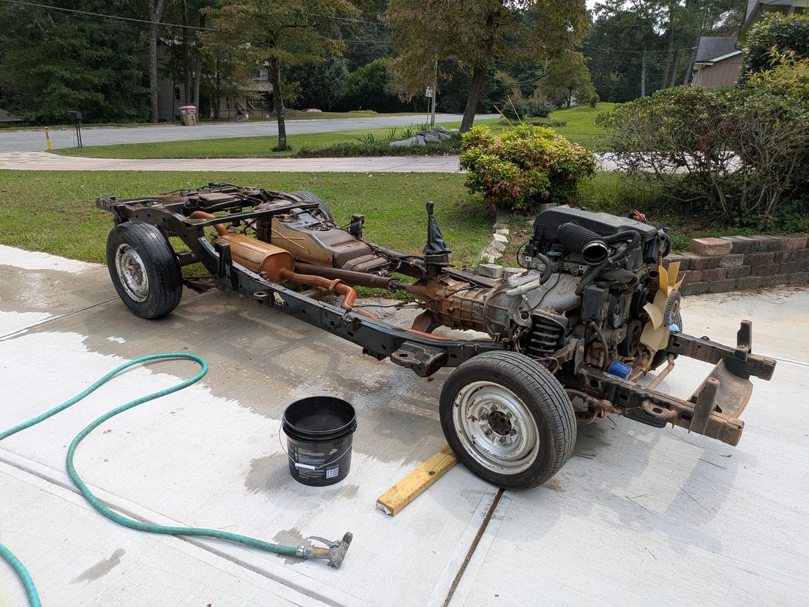 Rolled the frame outside and gave it a good scrub while inspecting it. Literally no rust, it's unbelievable. I love Georgia. Just that good red clay caked up everywhere. Lots of gears turning in my head.